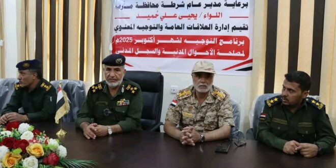 برعاية مدير عام شرطة محافظة مأرب اللواء يحيى حُميد، نفذت ادارة العلاقات العامة والتوجيه المعنوي بشرطه مأرب اليوم الحميس نشاط توجيهي توعوي لفرع مصلحة الأحوال المدنية والسجل المدني حول قيم واهداف ثورة26سبتمبر و14أكتوبر و الهوية الوطنية