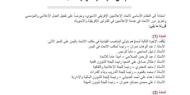 وأكد القرار، الصادر يوم الخميس 16 أكتوبر 2025م، بدء العمل به من تاريخ صدوره، ودعا الجهات ذات العلاقة إلى التعاون مع المكلفين بما يحقق أهداف الاتحاد في دعم الإعلام والتنمية المشتركة بين دول إفريقيا وآسيا.