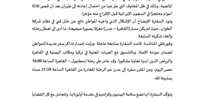 وشددت السفارة على أن سلامة اليمنيين وكرامتهم تمثلان أولوية قصوى في عملها، مؤكدة تعاملها المسؤول مع جميع الحالات الإنسانية. كما دعت المسافرين إلى ضرورة التحقق من متطلبات الترانزيت والتأشيرات ومسارات السفر قبل المغادرة لتفادي أي إشكاليات محتملة.