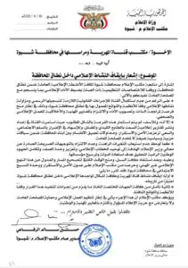 كما وجّه القرار إلى قناة المهرية ومراسلها في محافظة شبوة مع إرسال نسخة إلى محافظ شبوة ومعالي وزير الإعلام.