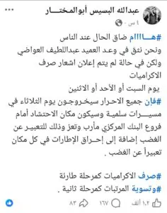 تداولت صفحة الناشط عبدالله البسيس أبو المختار رئيس رابطة الجرحى والمعاقين. منشوراً دعا فيه إلى التحرك الجماهيري في حال عدم صرف الإكراميات خلال الأيام المقبلة. مع التأكيد على استمرار المطالبة بالحقوق المالية.